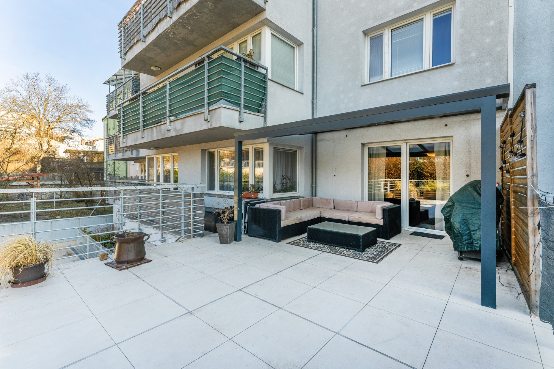 Terasa o rozloze 60,6 m² je skutečným klenotem tohoto bydlení a dostanete se na ni jak z obývacího pokoje, tak z ložnice. Nabízí dostatek místa pro venkovní nábytek, gril a dokonce i květinové záhony, což ji činí ideálním místem pro vytvoření vlastního malého ráje uprostřed města.